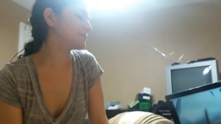 Сосет своему парню пока он смотрит порно. Девушка повторяет некоторые приемы порно актрисы и доводит своего мужчину до оргазма. После чего собирает сперму в рот и глотает ее.