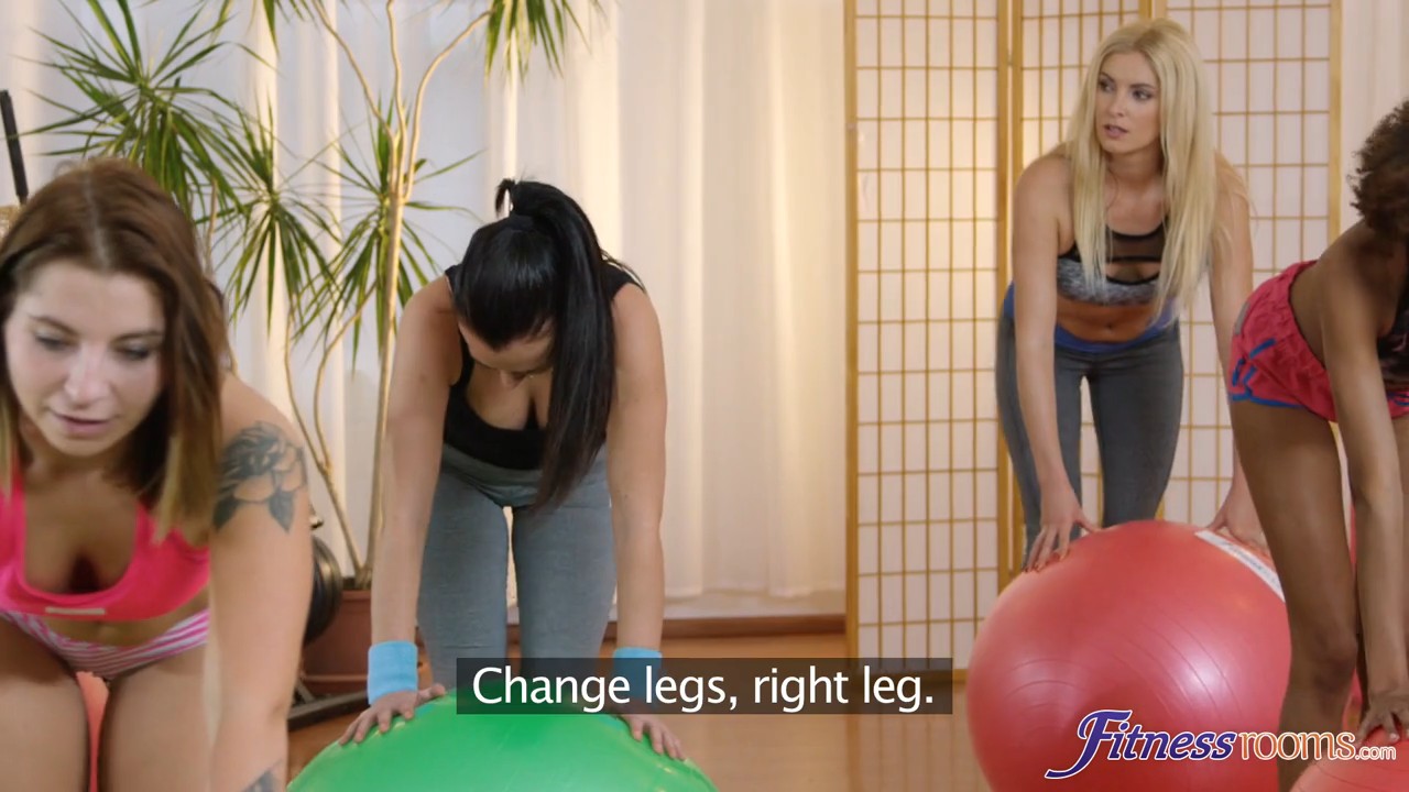 Секс вместо фитнеса - лучшая замена спорта. Короткостриженная негритяночка и брюнетка во время занятий так возбудились, что не смогли удержаться. Девушки уединились и занялись сексом, а потом к ним присоединилась блондинка (которая спалила девчонок и тогда ей предложили присоединиться). Телочки страстно отлизали друг другу и остались очень довольны.