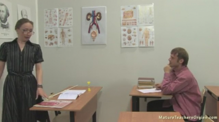 Самый тупой ученик из класса не может разобраться в биологии, а может даже не пытается. Пришлось ему остаться после уроков на дополнительный урок, который соизволила провести биологичка, потратив собственное время на прохождение части предмета заново. Начала она рассказывать со становления биологии, основоположников, разбора скелета человека и репродуктивной системы, являющейся самой важной в организме. Он все равно ничего не понял, идиот! Тогда дама села перед ним, отодвинув трусики в сторону и стала рассказывать, показывая где что находится. Так стало намного понятней. Пришло время объяснять как делаются дети, но как?! Да, на своем примере. Женщину нужно подготовить, - с этими словами учительница прислонила голову ученика к клитору, заставив поработать языком. Сама же она тоже сделала минетик, забравшись на стол и командуя что делать дальше двоечнику.