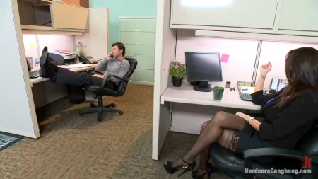 В конце рабочего дня трое мужчин решили развлечься. Парни напали на сисястую секретаршу и без прелюдий один из мужчин вонзил член в рот несчастной, а второй - в вагину. Мужчины менялись местами и каждый отымел телку в чулках вовсе щели.