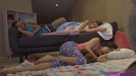 Родителей нет дома, поэтому было решено пригласить подружку сестры переночевать. Братик принес новый dvd-диск с ужастиком, который девчонки включили незамедлительно перед сном. Сам парень переоделся в костюм монстра из фильма и трахнул сестренку, боящуюся повернуться, чтобы посмотреть кто это был. Даже после девушка не рассказала подруге о приключившемся, она подумала, что это все привиделось из-за страшного кино. Трое легли спать, чувак лег на диване с гостьей, а сестренка осталась на полу. Спать гаденышу не хотелось, поэтому он стал приставать к спящей худышке, которая проснулась и занялась с ним сексом, пытаясь не разбудить лежащую на полу. Но та все равно проснулась, присоединившись к трахающейся паре.