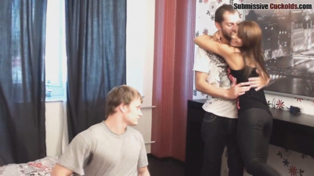 Девчонке совсем надоели ролевые игры, ей хочется разнообразия, но это вряд ли выполнимо с нынешним молодым человеком. В разговоре об этом, она предложила позвонить еще одну парню, попросив приехать на чашечку чая, а там как пойдет. Через 15 минут явился гость, член которого стала трогать развратница при своей второй половинке, который сперва возмутился наглости, но потом и сам получил за щеку, вместе с подружкой. К такому разнообразию парнишка не был готов, но ради любимой согласен перетерпеть любую подлость, даже смотреть как давалка в нескольких сантиметрах от его лица отсасывает другому. Почти через слезы бывшему натуралу пришлось проглотить чужую сперму с закрытым ртом.