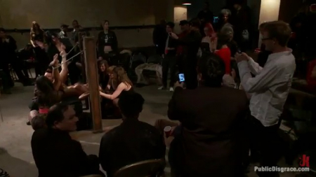 Молодая секси телка сидит в центре зала со связанными руками. А вокруг находится целая толпа зрителей - женщины могут принять участие и потрахаться с симпатягой, мужчины же только посмотреть. Поначалу девушки стеснялись выходить в цент и заниматься прелюдным сексом. Но в скором времени стеснение прошло и осталось только неумолимое желание овладеть аппетитной добычей.