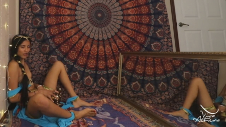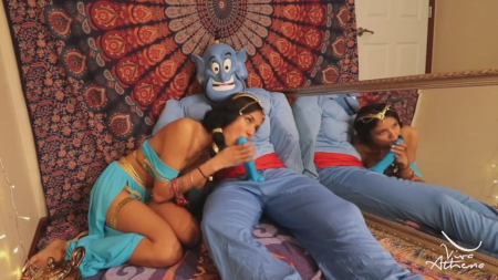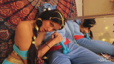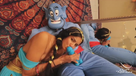 Пока Аладдин покоряет соседние царства и играет в героя, его суженая принцесса Жасмин сильно загрустила, ведь некому удовлетворять королевскую похоть прекрасной брюнетки в красивом восточном одеянии. К счастью, Джинн остался дома, поэтому девушка воспользовалась его лампой, трахнув пизденку носиком лампы перед зеркалом. Откуда-то взялся вибратор, но довольно быстро Жасмин вызвала заточенное мифическое существо, отсосав его синий хуй на полу, а в это время он улыбался застывшей пугающей улыбкой. Конечно простолюдину в белых шароварах они ничего не расскажут.