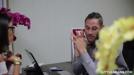 Обычный день для уставшего сидеть в офисе сотрудника. Единственное, что за сегодня произошло приятное - на пороге появилась девушка, которая ищет работу. С виду возможная будущая работница весьма привлекательна, одежда откровенна, а сама она небольших размеров азиаточка в очках. Только начав беседу, на телефон мужчины вновь позвонили и он отвернулся в кресле, обсуждая какие-то скучные моменты. В это время за его спиной брюнетка установила экшн-камеру к цветку, а сама начала скакать на фаллоимитаторе, спалившись в процессе продолжения собеседования. Сразу было понятно, что что-то не так, ведь соискательница поочередно поднимает попку и опускает, немного меняясь в лице. Сообразив в чем дело и найдя записывающее устройство, работодатель вывалил приличных размеров пенис, предложив не мучать себя всякими посторонними предметами и получить действительно хорошее удовольствие. Это первый раз в жизни обоих, когда собеседование заканчивается на очки.