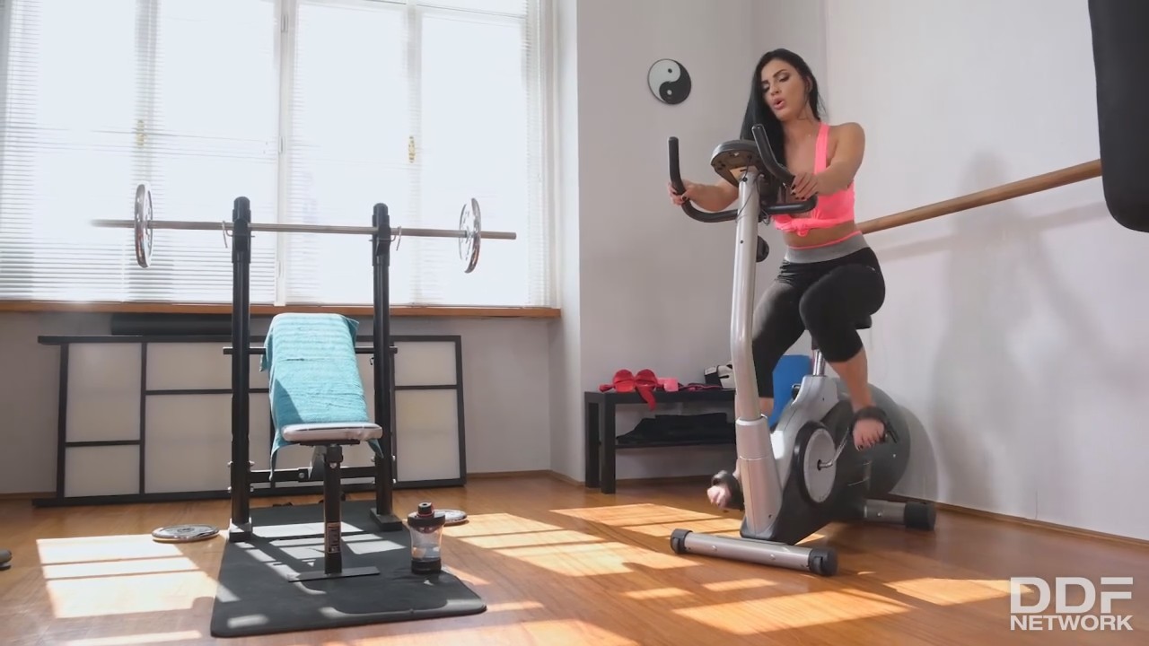 Небольшой спортивный зал, в котором занимается всего один человек, арендован на определенное время. С минуты на минуту должен прийти тренер, который объяснит брюнетке как правильно держать спинку в приседаниях, а пока можно поколотить грушу руками и ногами, заняться другими не слишком тяжелыми вещами. Зашел высокий парень, представился и веселье началось. Обтягивающие лосины сводят с ума, жопка и без того хороша с виду, так ее хозяйка еще и начала тереться. Просто так такое оставлять нельзя, нужно действовать. После перепиха по всему залу, клиентка наконец-то начала правильно делать упражнения с обконченной ягодицей фитнес-инструктором.