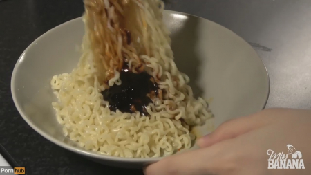 Захотелось кушать. Есть несколько минут чтобы приготовить себе острую китайскую лапшу. Стало интересно что будет если совместить сразу два удовольствия: прием пищи и секс. Актриса домашнего жанра поставила перед собой тарелку и начала кушать палочками, стоя раком и мешая себе всасывать лапшичку фрикциями и покачиваниями. Тарелка осталась полностью пустой, а вот прозрачный стакан наполнился спермой. Его бедолага попросила дать чтобы избавить от полыхающих ощущений в ротике. Жадно проглотив содержимое, она все же побежала к крану с водой, заплаканная и вспотевшая. Такие обзоры еды нам по душе.