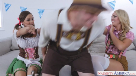 Веселая троица выпивает уже не первый стакан хмельного напитка, рассказывая анекдоты и шутки из прошлого. Отличное настроение поднимает алкоголь, но оно слегка омрачилось двумя друзьями, которые обсмеяли парня за странную одежду, которая является нормальным для праздника Октоберфест. Девушки решили поддержать собутыльника и разделись до симпатичных коротких белых чулок для него пока он вышел, а когда вернулся, то вжарил блондинке и брюнетке, а те два дурака так и будут дрочить свои вялые писюны, в то время как здесь и сейчас проходит крутая групповуха жмж.