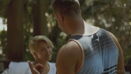 Старенькая машина подъехала к дому. Из нее вышел молодой человек, почему-то резко передумавший заходить через основную дверь. Связано это с тем, что ему не хотелось бы встречаться с матерью и начинать заново прошлый разговор о его хобби играть с друзьями в футбол. Похотливая женщина решила вести себя по-другому и наконец использовать ту кровать, что уже неделю стоит под открытым небом на заднем дворе. Парнишка долго не хотел принимать в этом участие, но настырная мачеха смогла трахнуть пасынка и дать понять, что его она любит больше всех на свете.