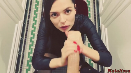 Свидание молодые люди решили провести в местной кальянной. Это хорошее заведение - играет расслабляющая музыка довольно тихо и не мешает, кальян получился в меру терпкий и вкусный, а девушка так и просится чтобы ее потрогали между ножек. Игривая натура легко пустила пальцы бойфренда пошалить через колготки и почти сразу оба отправились в туалет, где уединились для секса. Худенькая темненькая россиянка стоя раком смотрела на себя в зеркало, а потом прыгала сверху, отдрочив в финале в свой ротик. Теперь можно вытереться и продолжить наслаждаться компанией друг друга.
