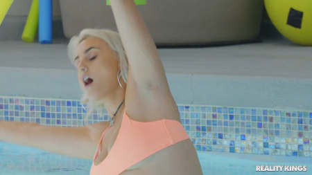 На первых порах стеснительная крашеная в светлый цвет волос девушка дождалась своего инструктора. Он обещал провести тренировку в своем личном бассейне и показать несколько новых упражнений. Гостья сама ничего не умеет, да к тому же мешает одежда на сиськах. От нее она быстро избавилась, ожидая, что и парень снимет с себя трусы. Теперь ребята трутся голыми телами друг о друга, у одного встает хуй, другая становится между ног еще более влажной. Это значит, что пора выбираться из бассейна и идти в более удобное место трахаться, например к хозяину домой. Там он смог показать еще парочку упражнений со влагалищем.