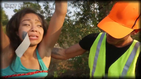 Парень охотился в лесу и наткнулся на связанную прелестную милашку. Но вместо того, чтобы освободить девушку, парень начал ласкать симпатягу даже не смотря на ее протесты. Связанная беззащитная девушка в лесу настолько возбудила мужчину своей беспомощностью, что он не удержался и изнасиловал несчастную невольницу.
