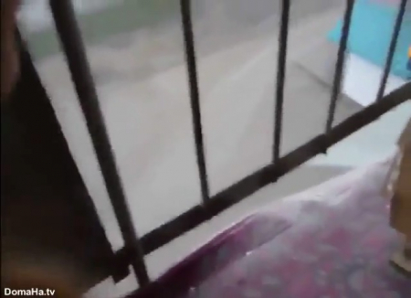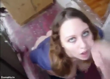 Русская супружеская пара уединилась на не застекленном балконе. Рыжеволосая супруга встала на колени перед мужем и принялась сосать мужчине, а тот снимал жену на камеру крупным планом. Потом поставил прелестную женщину раком и вошел в нее твердым членом.
