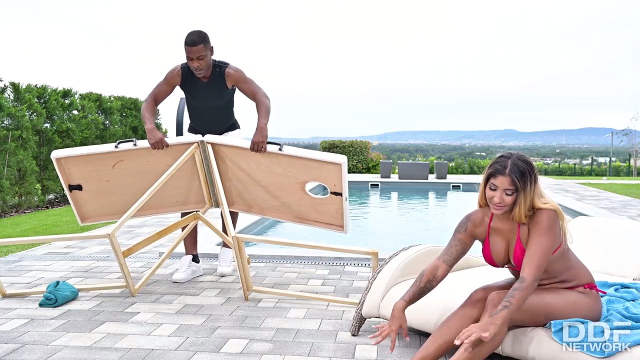 Хозяйка дома совсем забыла, что должен прийти массажист, двери всегда открыты. Она успела еще немного стать более копченой, помастурбировать и в последний момент он пришел, пришлось извиняться за слишком радушный прием. На массажном столе стало так хорошо, особенно из-за прерванного удовольствия, что загорелая телка стала проявлять неоднозначные знаки внимания - подставлять киску под руки и вообще тереться о любую часть мужского тела. Ну тут и дураку понятно: надо ебать пока тепленькая, чем и занялся чернокожий гость рядом с бассейном, оприходовав во все искушенные дырочки.