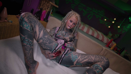Умница-умелица взяла заказ прорекламировать секс игрушки не выходя из собственной спальни. Одна из них - розовый ребристый дилдо ей понравился больше остальных. Ей так приятно его вытягивать и засовывать вновь, половые губки тянутся вслед. Помогает себе с удовольствием она еще вибратором, а для самых искушенных зрителей расшиперила дырочку металлическим инструментом, чтобы каждый мог заглянуть в развратное лоно. Еще для пущего кайфа татуированная до самой головы фрик-телка воспользовалась второй игрушкой, заткнув писю, пока первый прибор для девочек проникает в задницу не без помощи руки.