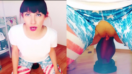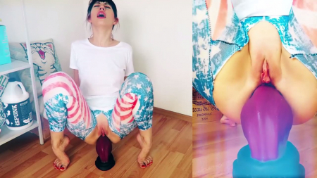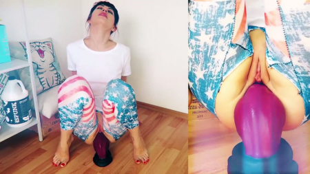 Девушка с оттопыренными ушами имеет большой арсенал, любая армия позавидует количеству единиц игрушек. Вновь она нашла новый драконий самотык, огромный как и другие. Тут нечему удивляться, малышка в разорванных штанах давно практикует анальный фистинг и такие тренировки проходят без следа. В этот раз онанистка включила две камеры, одна из которых снимает всю хозяйку, вторая записывает поближе, чтобы видеть отчего она вскрикивает и сладострастно охает, особенно когда фаллос проваливается, проходя через анус. Все это время брюнетка сверху симпатичным лицом к камере, либо кругленькой попкой.