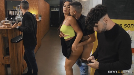 Бариста ненадолго отлучился, а у него перед стойкой уже образовалась очередь из трех человек. Девушка нагнулась разобраться с расстегнутой застежкой обуви, в это время двое парней увидели ее сочную задницу, игриво выглядывающую из-под юбки. Но лишь один работник кофешопа, случайно уткнувшийся туда своим пахом, привлек внимание брюнетки. Она дала себя прощупать, попросив ни о чем не беспокоиться, а потом трахнула паренька вагиной стоя. В этот момент на них никто не смотрел. Первый в очереди стал злиться, стуча по звонку. Пришлось быстренько надеть передник и принять заказ, пока девушка ему отсасывала. Последний в очереди заметил ее и тоже захотел, но кучерявому отказали, так как он недостаточно хорош. Сразу после этого любовники пошли в отдельную комнату, где занялись аналом. Неудачник так все стоял и ждал с влюбленным взглядом возвращения шлюшки (с никами Sofia The Bum, Sue The Bum, Sofia De Bum).