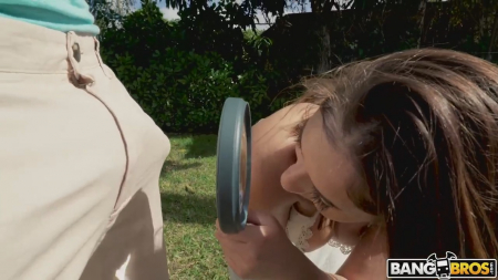Оператор вышел посмотреть чем занимается актриса, стоящая раком на выпрямленных ногах. Латиночка сказала, что ищет муравьев с лупой, но пока ничего не удалось увидеть. Зато удалось многое разглядеть когда пришел друг камерамэна - высокий подкаченный чернокожий парень. Поглядев в увеличительное стекло на его пах, мелкая потаскушка сразу поняла, что там хранится нечто очень длинное, дающее девушкам кайфовать и делать больно. Малышке удалось уговорить достать его пососать, а потом оба отправились трахаться в дом, так как на улице слишком жарко. Жилистый сникерс весь стал скользким от естественных выделений девушки и слюны.