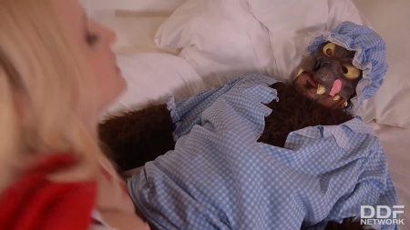 На кровати в сорочке лежал Черный Волк, читавший книжку как его недавно съеденная жертва. В гости по расписанию пришла грудастая шапочка, которая принесла вкусные пирожки и еще игрушечного зайку, чтобы старушке не было так скучно одной. Только вот руки у нее будто грязные - уж точно изменили оттенок, да и зубы слишком острые и длинные. Когда волк понял, что его разоблачили, он накинулся на светловолосую красавицу Красную Шапочку, впившись в ее пирсингованные дойки. Бедняжка очень сопротивлялась и горевала, но когда почувствовала возбуждение и увидела здоровый член зверюги, даже как-то забыла про съеденную родственницу.