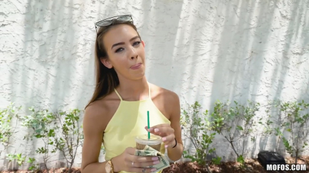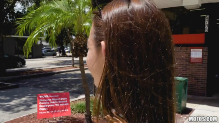 Незнакомка не сразу остановилась поговорить с незнакомым парнем, который очень просил с ним поболтать, не забесплатно. Такая тут жара, но 20 баксов - это 20 баксов, их не так просто заработать, но за легкие вопросы - почему бы и нет. Сумма в руке девушки все увеличивалась и она может стать еще больше, если согрешит с ним где-нибудь подальше от людей. Закуток улицы оказался вполне подходящим местом. Член у парня как весомый аргумент, заставил снятую шлюшку пойти на дальнейшие приключения на чужом дворе с бассейном, где худышку оттрахали вагинально от POV-вида и даже дали немного искупнуться.