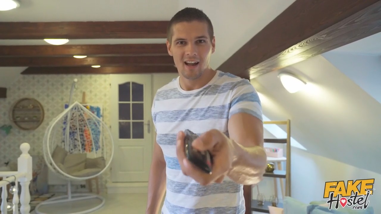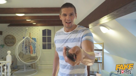 Парень отдыхал на втором этаже хостела, когда туда поднялись две подруги, совсем не замечавшие лежащего на диване долгое время. Телочки разделись до трусов и легли валетом на кровать. Герой видео хотел подойти поближе подсмотреть, но тут перед ним магическим образом появляется пульт от телевизора Samsung с заклеенной надписью, которым он смог регулировать яркость лампочек и даже заглушать девчонок. Очень полезная функция, но не дотягивает до той, что обнаружилась далее: другая кнопка переодела телочек, а самая нужная их раздела. Счастливчик решил оставить их в сексуальном белье, а вот почему им вдруг сразу захотелось - это другой вопрос. Когда прибежал их друг, его удалось успокоить только паузой.