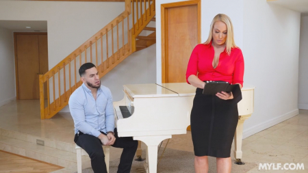 Плотная блондинка возраста крепкой милф готовится ко встрече с учеником - женщина преподает уроки игры на пианино. Вскоре он появляется на пороге, целует женскую ручку и они оба идут к инструменту. Пианистка показывает как сыграть мелодию, открытую на планшете, потом сам парень пытается отыграть, но очень сильно отвлекает бюст дамы, находящийся прямо возле лица. Белокурая музыкантка села рядом, пара влюбленно поцеловалась поняв, что начинается большее и вскоре хозяйка стояла на коленях, отсасывает перчик малознакомого парня. В большом доме нашлось ложе, будто специально поставленное для утех леди.