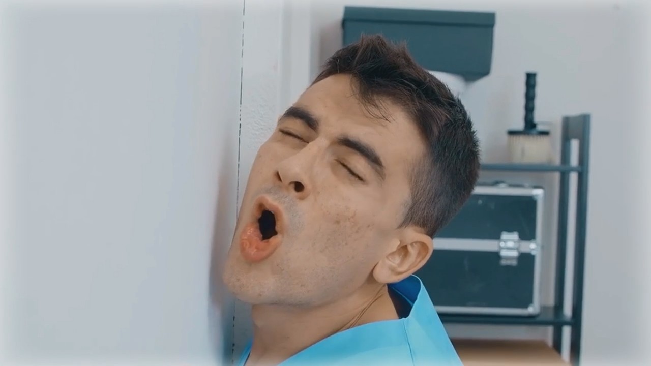 Бестолковый пацан пришел на стажировку в настоящую больницу. В первый же день ему пришлось познакомиться с одной очень сексапильной сотрудницей, но пока что он об этом не знает, так как она переодевается за стеной и ему хочется поскорее на нее посмотреть. Взяв дрель, он проделал отверстие в перегородке, туда парнишка высунул добротный хуй, который заметила короткостриженная женщина в очках, принявшаяся его лобызать с милой улыбочкой. Но работу нужно как-то делать, другой врач с помощницей привез симулятор человека на каталке для тренировки. Собственно, это никак не помешало насаживаться попой стоя спиной, а когда коллеги немного разошлись, то и заняться нормальным сексом. Экспрессивная женщина наконец-то увидела щуплого хозяина пениса, оттрахав его так, что доктора сбежались подглядывать через щелку как там здорово развлекаются.