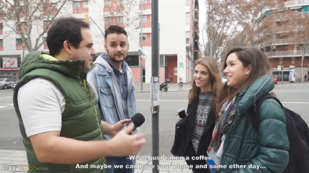 Два парня пытаются снять на улице девку. Ребята подходят к девушкам и типа проводят социологический опрос. В конце концов удача улыбнулась друзьям и ребята наткнулись на доступную шлюшку. Девка сразу же согласилась на секс втроем, и в какой-то каморке отдалась парням. Один ебал телку в рот, а другой в вагину.
