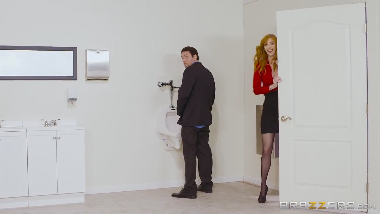 Изголодавшаяся по членам рыжая сотрудница офиса вышла из кабинета после просмотра присланных порно картинок от коллеги по электронной почте и пошла в туалет помастурбировать, но тот был закрыт на техническое обслуживание. Пришлось тайком топать в мужской. Туда в этот момент зашел справить нужду мужчина, чей член очень понравился подглядывающей из кабинки барышне. Она чуть позже дождалась когда тот снова сюда зайдет и пошла следом. Прямо сказав, что ей сильно хочется секса, шлюшка отвела мужика к себе в офис, трахнув его ржавой лоханкой на собственном столе.