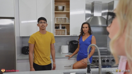 Телочка вместе с бойфрендом пришла в гости к товарищу, который снимает у сексапильной женщины квартиру. Она ему как мать, буквально, готовит, иногда за ним прибирает. Гостья еще сильнее захотела поебаться когда увидела как хозяйка светит попкой и вместе с черным приятелем отпросилась в ванную комнату, хотя сами они пошли в комнату пацана позаниматься петтингом. За этим занятием их застал сперва очкарик, а потом и сама женщина. Она же и придумала зачем-то странный план поменяться партнерами, чтобы ее большим членом трахнул негритос, а малявка всадил блондинке. Для него у дамы нашлась насадка на пенис темного цвета, а чтобы та ничего не заподозрила, попросила надеть заранее маску для сна на глаза. Так они трахались в одной и разных комнатах пара на пару.