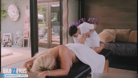 Основной массажист-индивидуалист скоро собирается на пенсию и сейчас он заранее взял молодого ученика в подмастерья и как раз сегодня должна прийти очень требовательная постоянная клиентка, которая любит когда начинают с ног, а потом только переходят к плечам. Стоит это записать. Вот и она появилась, по-дружески обнявшись со стариком. Он проводил в зал, где женщина разделась, заметив как мальчик подглядывает через приоткрытую дверь. Пришла пора делать работу и получается, мягко сказать, не очень - массаж слишком слабый, но все изменилось когда блондинка с огромными сиськами приподняла задницу. Неопытный массажист воткнулся в нее носом, заизвинявшись перед клиенткой. В этот раз все пошло не как обычно, так как милфа перевернулась на спину, приказав заняться ее грудью и другими дырочками. Комплимент однозначно заслужен, а бизнес точно перейдет Джорди.