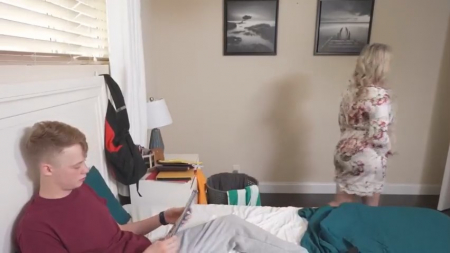 Пиздюк совсем от рук отбился - нихера не делает уроки, говорит все на удаленке, но он точно пиздит. Жена отца, ненастоящая мать, показала ему сиськи и сказала, что они только для настоящих мужиков, а такие лошары должны делать домашнее задание. Пацан в секунду все сделал как профессор, за что заслужил немного их потискать и пососать соски. На большее рассчитывать не пришлось, но после того как он поподглядывал через приоткрытую дверь в ванной за маманей, в башке родился хитрый план - сунуть хуй в ведерко с попкорном. Блонда схватилась за дрочило, закричала, но все равно ринулась сосать и трахаться, забыв про родительские обязательства.