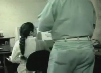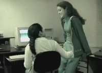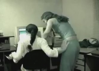 Две подружки устроились в одно и то же место на работу. Было это еще во времена "пузатых" мониторов, а значит примерно начало 2000-ых годов. Тогда уже у всех американских ребят были камеры, в офисах стояли скрытые, вот на них и попались две темноволосые лесбиянки. Гостья кабинета стояла рядом, предпринимая несколько попыток снять с себя штаны, чтобы сидящая за клавиатурой с бумажками ей отлизала, но какой-то мужчина несколько раз заходил в кабинет, прерывая кунилингус лесбиянок. В итоге полноценно пошалить им не удавалось, а вот охраннику повезло получить данные черно-белые видеозаписи.