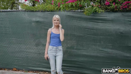 Парень представился ютубером с крупного канала, попросив незнакомку остановиться на пять минут, чтобы поболтать. За это она получила первую сотку долларов, далее еще проще стало ее раскрутить показать сиськи за дополнительную плату. Она была занята и собиралась на встречу с друзьями, как нетрудно понять, она туда так и не дошла, забравшись внутрь фургона, где обработала ротиком и влагалищем достаточно крупный член какого-то парня, тихо сидящим внутри пока 19-летнюю блондинку раскручивает более разговорчивый негодник. Ей так понравилось, что она договорилась встретиться еще раз в другой день, в этот раз она оставила большую часть заработанного в тачке на полу.