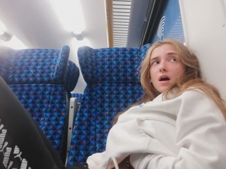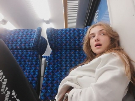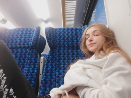 Молоденькая любительница получать легкое удовольствие заприметила, что вагон совсем пустой. Ее это сразу навело на мысль о мастурбации, к которой она приступила, просунув руку под штаны. Ее выражение лица говорит о том как ей хорошо, но приходится смотреть по сторонам, чтобы никто из пассажиров электрички ничего не заподозрил. Второй рукой она трогала грудь - так намного приятней - весь кайф волнами разносится по телу нимфоманки.