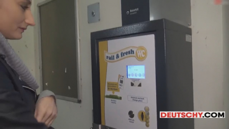 Ночная вылазка на вокзал, до прибытия поезда остается еще ровно час. Мужчина предлагает своей пассии пока не стоять на уличном перроне, а сходить в туалет. Они покупают билетик в автомате, дверь автоматически закрывается и блокируется, а значит никто не сможет помешать провести время наедине. В разумных временных пределах, естественно. Немецкая шлюха отсасывает, ее трахают рачком, после чего отпускают для мастурбации, которой она быстро довела себя до струйного оргазма, подставив язык для спермы приятеля, которую же проглотила, ущипнув себя за сосок красивой груди.