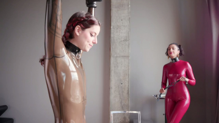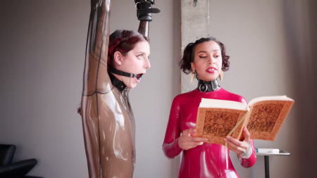 Сексуальная рабыня в латексе стоит с привязанными руками к потолку и не может присесть даже на минутку. Игривая подружка читает комплименты из книги, но Кэмерон они не нравятся, зато она обожает вставлять кляп в рот, правда, вместо кляпа во рту оказалось кольцо с ремешком, из-за которого слюна начала капать на пол когда к пизденке через костюм приложили мощный вибратор. С него очень не хотелось слезать пока самый пик удовольствия не закончится. Раба по окончании поделилась своими впечатлениями, находясь явно в приподнятом настроении, хотя ножки порядком устали.