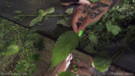 От одного только первого прикосновения куста крапивы к заднице тело рабыни пытается податься вперед, но это попросту невозможно, ведь она зафиксирована цепями по руками и ногам, а также шее. С каждой новой минутой становится только больнее, а когда зелень прикасается к вагине... Тут даже не нужно представлять насколько это неприятные ощущения, усиливающиеся и усиливающиеся по всему краснеющему потному телу. Лишь к концу наказанную освободили, чтобы сесть ей на лицо и подрочить вибратором с кустиком на животе. Такие вот жестокие извращенки эти барышни из куинснейк.