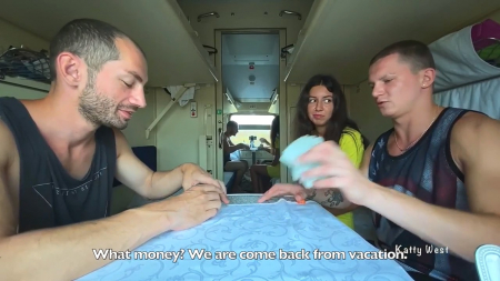 В купе ехали трое - парочка, возвращавшаяся на поезде из отпуска, и их новый знакомый - обычный парень, который любит поиграть в карты не на просто так, а на деньги. Так как у молодоженов не осталось наличных денег, а глава семейства уже проиграл в "дурака", их приятель предложил все порешать попроще - брюнетке придется ему отдаться прямо сейчас и долг будет закрыт, но при этом рогоносец должен смотреть на них, а потом и вовсе побороть себя, полизав киску после чужого члена. А нет, еще не все: он слизал сперму с лобка любимой, отказавшись сразиться в карты еще раз, хотя подружка проголосовала за.