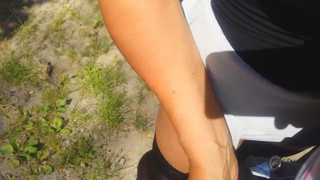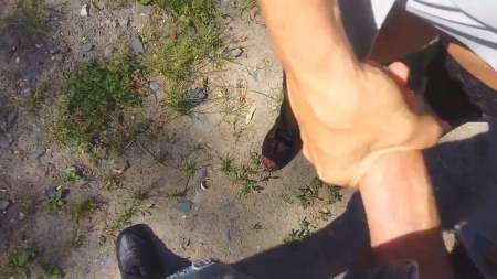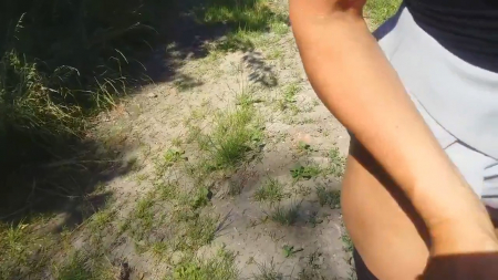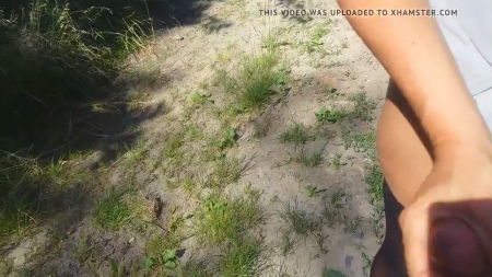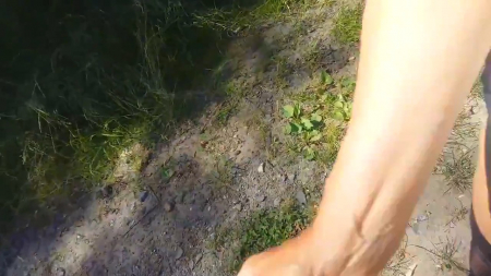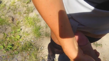 Сверху слышны смачные поцелуи, а внизу творится кое-что более интересное. Супруг, прогуливаясь с любимой женщиной по лесу с поющими птицами, попросил остановиться, поднять и так короткую юбочку и подрочить его член на шикарные ножки в чулках, которые смотрятся еще более замечательно, из-за того, что вторая половинка стоит высокими каблуками на земле. Так как они стоят лицом друг к другу, она взяла его хер в руку наоборот, но это придает совсем другие ощущения и вскоре мужчина кончает на ляжки, продолжая смаковать ее язычок в своем рту.