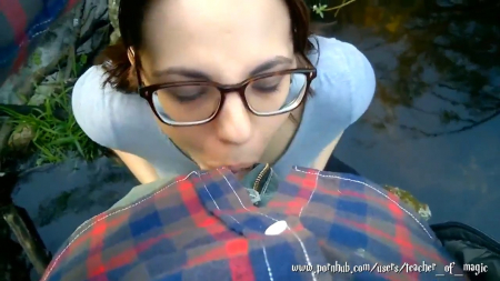 Прикольная девица в очечках огляделась, чтобы увидеть бегающего вокруг питомца, и тут же присела на корточки возле шумной речки, заглотив уже успевший встать член бойфренда до глотки, снимающего сверху симпатичное лицо молодой подружки. Уже не в первый раз нам попадается эта барышня и только сегодня нам стал известен ее никнейм, помещенный прямо на видео. Что ж, девочка действительно умеет качественно потреблять висячку и всего за несколько минут доводить до оргазма, причем красотка не боится вкуса спермы и почти каждый раз проглатывает. Ну вот, и собаку выгуляли вместе, заодно и рот прополоскали хуем.
