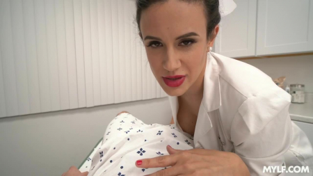 Надев резиновые перчатки, красивая женщина в белом халате начала обследование, приблизившись максимально близко к половому органу мужчины, от чьего лица мы будем смотреть видео. Между руками и лицом одна тонкая ткань халата и она здесь не нужна - медсестра начала ласкать руками пенис, а потом обхватила его горячими губами и долго-долго сосала. Пациент чуть было не кончил в рот, но врач сделала перерыв, сев на стол, чтобы довести себя до оргазма вибратором и собственными руками. Но и это еще не все: осмотр завершился только после пикантного траха сексуальной медсестрички.