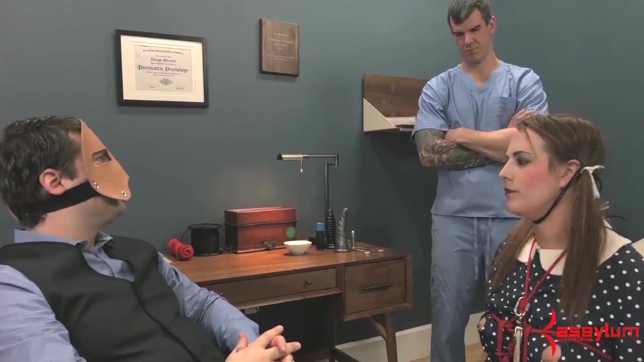 Начальник психлечебницы никогда не открывал лица своим многочисленным пациентам, большей частью из которых являются девушки и это не просто так, ведь здесь работают самые настоящие извращенцы, которым никто и никогда не перечит - отрицательный отбор: только худшие люди из худших, которым нравится доминировать и извращаться со слабыми. Очередная пациентка должна контролировать себя при минете и на всякий случай хозяин психбольницы вместе с помощником зафиксировали губы девки так, чтобы она не думала укусить когда ее будут по очереди ебать в рот. Самому главному извращенцу психушки кроме минета захотелось еще и отодрать бедолагу в веревках в задницу.