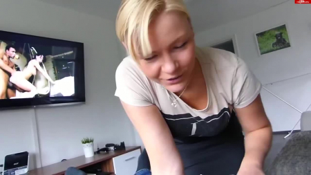 Мужской персонаж дрочит член на порнушку, включенную на телевизоре, на столе стоят карикатурные салфетки, чтобы в них накончать и ими же потом вытереть головку, выкинув все в мусорное ведро. В дверь постучала подчиненная и сразу же открыла дверь, не получив разрешение войти. Она принесла бумаги, но быстро убрала их в сторону. Блондинка тут же придумала как получить повышение и принялась классно отсасывать начальнику. Немка старательно работала головой, пока во рту на языке не образовалась белая лужица спермы, которой похвасталась извращенка, стоя коленками на полу.