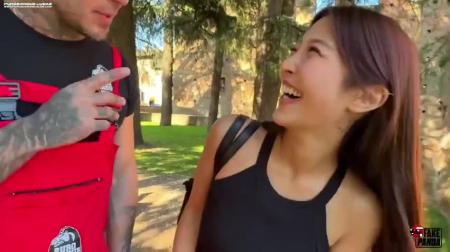 Парень ехал в стареньком автомобиле, его тормознула азиатка с картой, с трудом рассказавшая, что она потерялась и хотела бы добраться до замка. Татуированный водитель предложил подбросить деваху к достопримечательности, а заодно ей все показать. Та сразу как-то прониклась к большому человеку и даже с ним пообедала, а когда пришла пора возвращаться в город, то просто воскликнула от того, какой большой член ей предстоит сейчас распробовать, ведь в родной Японии таких нет, да и мало кто там станет трахаться внутри автомобиля или же на красном капоте где-то в лесу, не понять где.