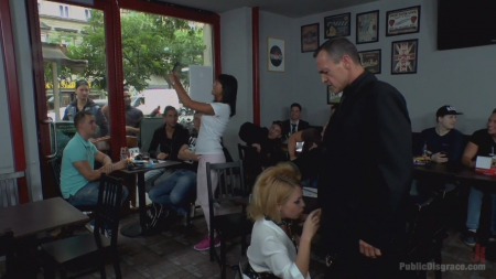 Симпатичная блонда любит жесткий секс. Она отдается в полное подчинение своему любовнику и становится для него послушной рабыней. Любовник привел симпатичную телку в спорт бар, полный молодых парней. И при них отымел милашку в рот. Когда же твердый член оказался в аппетитной заднице, толпа наблюдавших просто возликовала. Позже к трахающей парочке присоединился еще один мужчина и присутствующие "зрители" от восторга чуть ли не задохнулись - ведь они воочию увидели как два члена в попку проникают и даже на фистинг посмотрели.