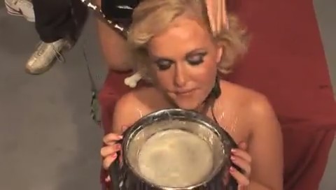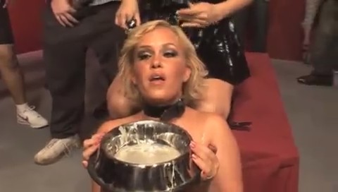 Любительница мужской эякуляции находится среди огромной толпы представителей противоположного пола. Короткостриженная очаровашка играет роль собачки - в ошейнике скулит и держит перед собой собачью миску, в которую, поднятые по команде мужики, начали кончать после мастурбации. Девушка дождалась пока все извергнут из членов сперму и наполнят ей чашу. После чего вылакала как домашний питомец всю целительную влагу и вылизала миску.