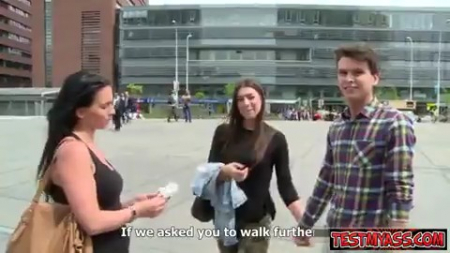 Сисястая брюнетка ищет подходящую пару - ведь ей так хочется заняться сексом втроем. Девушка опрашивает людей на улице возле торгового центра и наконец то удача улыбается ей. Очередные прохожие - парень с подругой оказались непротив. Оргия с незнакомыми прохожими удалась на славу.