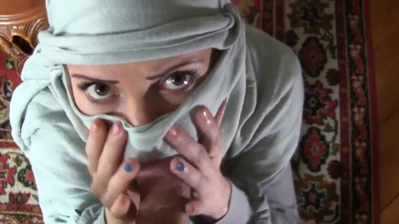 Молодая девушка сосет в парандже. Сначала молодая ласкает член прямо через ткань, а потом ей закрывает мужчина лицо паранджой оставив открытым только рот. Он трахает телочку в ротик твердым членом и снимает на камеру крупным планом.