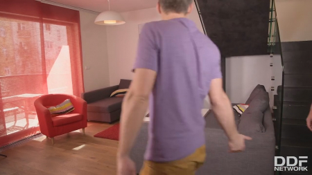 Пара ищет дом друга, с которым договорились встретиться. По навигатору они кое-как добрались до нужного адреса, обнимаясь и отвлекаясь на поцелуи по пути. Найдя нужную дверь, их встретил веселый мужчина, решивший провести небольшую экскурсию по месту жительства. После прогулки внутри двора, все трое вышли на мансарду, где девушка снова стала сосаться со своим парнем и рукой трогать за член его друга. Бойфренд не против того, что подружка хочет втроем, поэтому позволил ей расстегнуть ширинку и отсосать при нем, да и сам снял штаны и встал рядом, чтобы нимфетка отсасывала сразу двоим. Так как здесь есть еще и соседи, которые могут помешать, троица зашла обратно в квартиру, где телочке устроили крутую прожарку, оттрахав в обе дырочки одновременно, сменяя друг друга. Сисястой понравилось ходить по гостям и скакать по хуям.